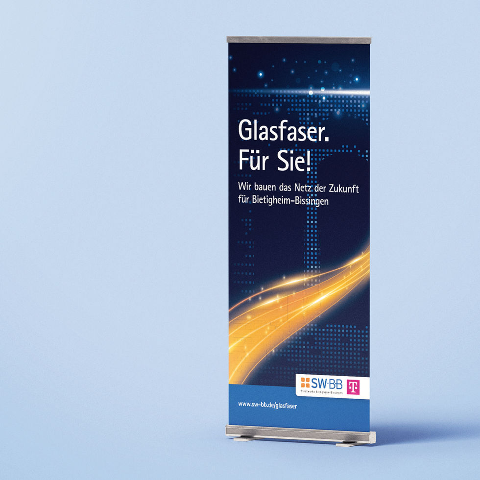Nach gewonnenem Pitch realisierte Nordwind freudig und stolz die Glasfaser-Kampagne der Stadtwerke Bietigheim-Bissingen. Entstanden ist ein prägnantes Key Visual, das den technischen Aspekt und den regionalen Bezug vereint – und schließlich auf Plakaten, Flyern, Messeständen, Roll-Ups und Werbeartikeln seine Anwendung fand.